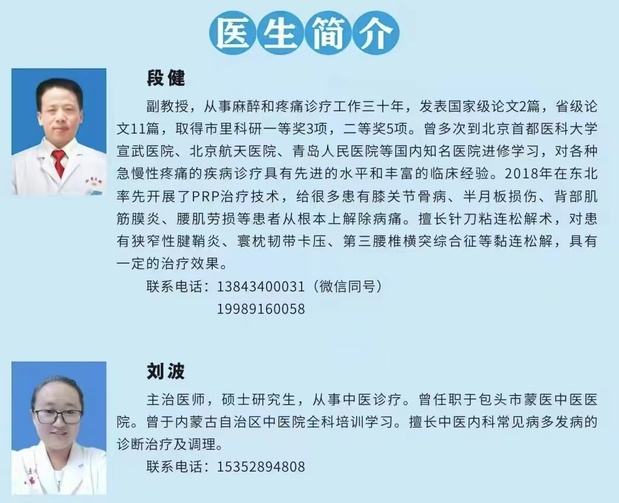 更值得信赖的是我们的专家团队 (图3专家团队展示):段健副教授作为东北地区PRP技术先行者,三十年专注疼痛诊疗,将国际先进技术与本地化经验完美结合;刘波主治医师发挥中医特长,为患者提供中西医结合的个性化治疗方案。